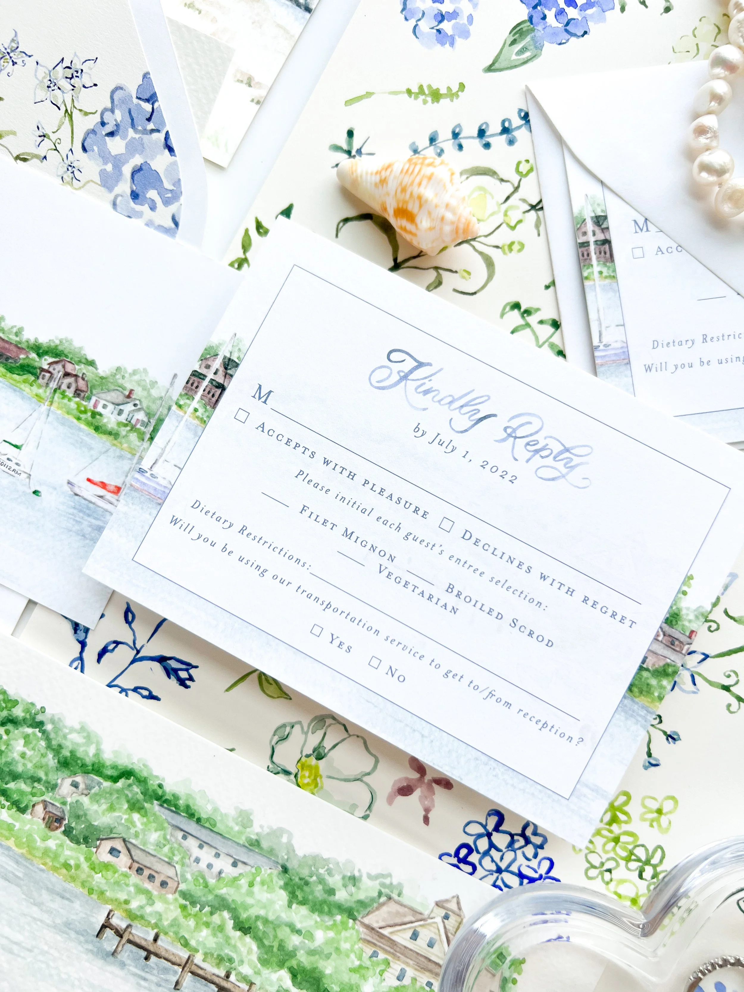 All of my stationery is completely custom, meaning that all of the watercolor illustrations and calligraphy are hand-created by me, and printed professionally on high-quality paper. This means when it comes to personalization the sky is the limit. I love working with couples to craft stationery that truly reflects their love story and the location where they've chosen to celebrate it!